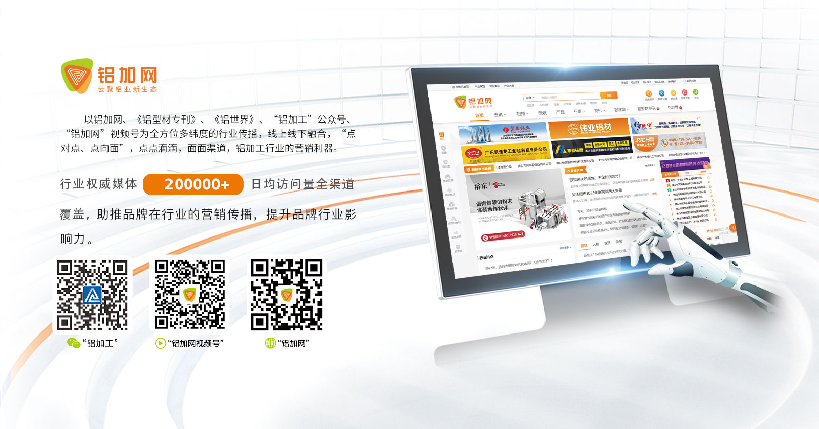鋁加網(www.albiz.cn)是聞名鋁加工行業的垂直門戶網站,云聚鋁業新生態,構建鋁業新場景,以albiz.cn 網站為核心,以移動云端、鋁加工微信、鋁加網視頻號、《鋁型材??泛汀朵X世界》雜志為載體,成為了鋁加工行業資訊和精準傳播的首選傳媒。鋁加網,采集和發布全行業信息資訊,提供線上展覽、在線直播、短視頻、品牌策劃、品牌運營、品牌傳播等全方位的專業服務。